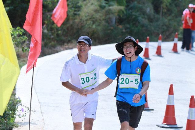 烈日當(dāng)頭,中間還夾雜著難度不小的連續(xù)上下山坡,特別是上準(zhǔn)提寺的最后一段1.3公里的爬坡路著實嚇退了不少參賽者。在最后500米的陡峭山路口,由于前29.5公里的熱浪襲人及體力消耗,隊員們已有點虛脫,前面的屏障就是最后的困難。已萌生倦意的大家,突然被鄧總一句“齊總應(yīng)該早已到達終點,此時或許正翹著二郎腿,喝著小茶,哼著小曲,悠哉游哉地看著山腳下的我們喔”所鼓勵。在這種半激勵半激將的鼓勵中,我們再不敢停歇,決定馬不停蹄地走到了準(zhǔn)提寺下,我們開始了終點前的最后挑戰(zhàn),終點就在前方。