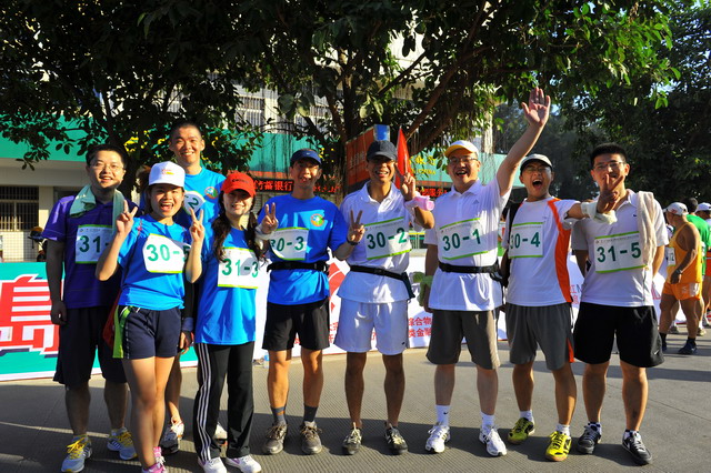 11月5日,秋陽燦爛,大家早已躍躍欲試,隊中負責(zé)后勤的我,早在比賽前夕就廣發(fā)注意帖:速干短褲、帽子、腰包、水杯、小方巾、鞋子等物品需必備;作為隊伍領(lǐng)頭雁的齊總則早已咨詢專業(yè)選手,提倡大家結(jié)合自己體力準(zhǔn)備能量棒、巧克力等緊急能量品;隊長鄧總在了解路線和路況后,制定了“穩(wěn)重取勝”的戰(zhàn)略,采取了“準(zhǔn)備活動做充足,先慢后快求適應(yīng),不因外因亂陣腳,敵疲我追求成績”的具體戰(zhàn)術(shù);隊伍中的另一名隊員則帶來了他專業(yè)的GPS定位手表,分時段匯報所走路程、當(dāng)前速度適當(dāng)與否,并提前告知提速準(zhǔn)備;我們的女隊友亞梅,則一路保持微笑,緊跟隊伍,偶爾爆出的一些冷笑話,讓緊張趕路的我們倍感清爽。