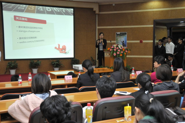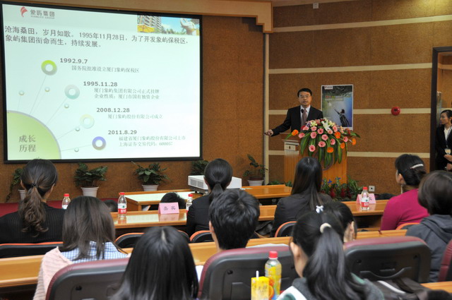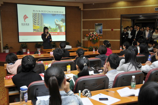 2012年象嶼集團(tuán)全國(guó)校園招聘首場(chǎng)宣講會(huì)于11月23日晚在廈門大學(xué)拉開帷幕。集團(tuán)人力資源總監(jiān)林志勇、象嶼股份人力資源部經(jīng)理林焱為同學(xué)們進(jìn)行了精彩的宣講并回答了同學(xué)們現(xiàn)場(chǎng)的提問,鼓勵(lì)廈大的優(yōu)秀學(xué)子們加入到象嶼的大家庭。據(jù)悉,此次宣講會(huì)吸引了近500位應(yīng)屆生參加,場(chǎng)面火爆,提問環(huán)節(jié)積極踴躍,會(huì)后現(xiàn)場(chǎng)收到簡(jiǎn)歷近500 份。